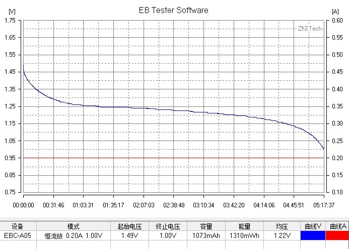 测试结果 1073mAH,内阻 60m欧姆,如果使用100mA恒流放电,会有更大容量。