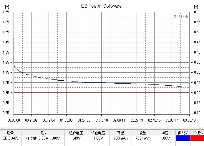 测试结果 709mAH,如果使用100mA恒流放电,会有更大容量。