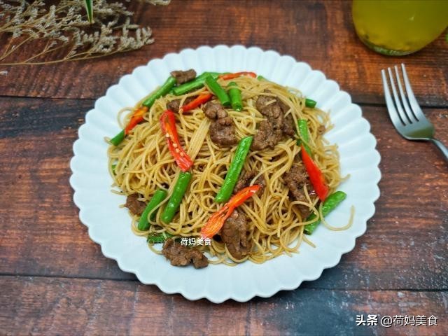 牛肉洗净先用刀背轻敲几下后切片,豆角切段,洋葱切丝,蒜头切片,辣椒切片牛肉放入碗里,加料酒,黑胡椒粉,淀粉和食用油抓匀腌制一会儿热锅凉油,油热后放入牛肉片滑炒变色盛出。再起油锅,放入蒜片,洋葱丝炒香,放入焯过水的豆角和辣椒翻炒均匀即可。炒牛肉的时间可以把面条也一起煮了,水开放入细的直面煮熟,来出过一下凉水放入炒好的牛肉锅中,翻拌均匀即可,最后加点生抽和老抽,蚝油和少许白糖调味,现磨的黑椒碎碎,拌匀即可。
