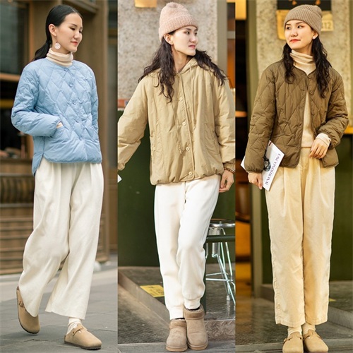 建议大家选择乳白色的萝卜裤来搭配,更适配秋冬季节的氛围感。乳白色的搭配效果高级又柔和,搭配一款温柔软糯的棉服更能穿出柔美可爱的气质。秋冬季节选择这一套保暖性和时尚感都很强,南方的姐妹们一套就可以轻松过冬!