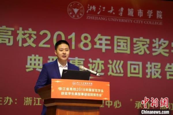 孙书剑在2018年浙江省高校国家奖学金巡回报告会上作报告。 孙书剑供图
