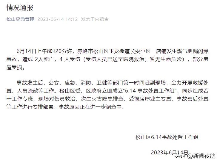6月14日上午8时20分许,赤峰市松山区玉龙街道长安小区一店铺发生燃气泄漏闪爆事故,造成 2人死亡,4 人受伤(受伤人员已送至医院救治,暂无生命危险),部分房屋受损。