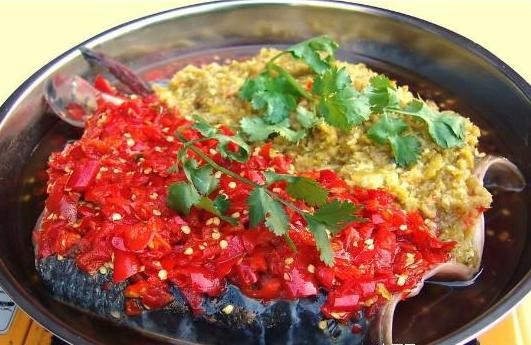 制作:1、将鱼头洗净,中间改刀,用花雕酒、盐腌制30分钟至入味后再洗净。2、将野山椒、酱椒、姜分别切米待用。3、锅内入猪油50克,将野山椒、酱椒 入锅内炒香,加入姜,调好味加入白醋待用。剁辣椒也同样用猪油炒香,加入味精、白醋待用。4、红、绿尖椒各切成长5厘米,宽2厘米的条。5、将鱼头洗好 后,一半放上野山椒酱椒,一半放上剁辣椒,入笼猛火蒸12分钟,将红绿椒轻轻氽水,待鱼头蒸好以后摆盘,走菜时淋猪油即可。