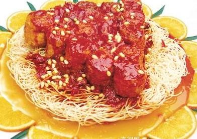 制作:1、带鱼洗净去骨,改刀成宽4厘米、长12厘米的鱼片,加料酒、葱、姜、少许盐和胡椒粉腌制10分钟备用。鸭蛋黄粉碎备用。2、将鱼片均匀打上生 粉,鱼皮朝里和敲好的鸭蛋黄皮一起卷好,用牙签固定,放入六至七成热的油中炸制2分钟呈金黄色捞出,2、锅留底油,下豆瓣酱炒出香味,接着放入80克番茄 酱、10克蚝油、2克鸡粉,熬成浓稠酱,将带鱼和蒜茸放入酱中煨制1分钟入味,淋入葱油出锅,放在炸好的龙须面上,洒上松子即可。
