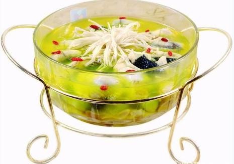 制作 1.桂鱼宰杀治净,去头、尾,将鱼肉片下,片成厚0.5厘米、重约5克的片,洗净后加A料上浆,腌渍10分钟。2.鱼骨洗净,入沸水中大火汆1分 钟,捞出控水,放入锅内,加鸡汤、豆浆大火烧30分钟,过滤杂质,用B料调味,将锅端离火口,放入鱼片浸约半分钟,出锅倒入容器内。3.鱼头、鱼尾上笼大 火蒸5分钟,取出放在容器两端。4.胡萝卜花、菜心分别入沸水中大火汆1分钟,捞出控水,与小西红柿一并放入容器内。5.明炉上桌,点燃装菜的容器下的酒精泥即可。