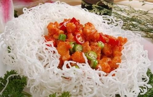 点评:此菜中龙须面粗细均匀,带鱼卷成圆形,造型对比显明。从口味上来看,鱼片卷上蛋黄,质地细嫩沙软,构思巧妙,尝试大胆。