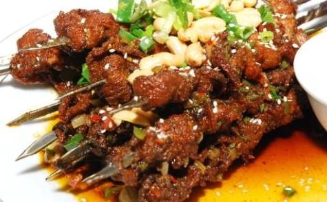 制作 1.牛里脊改刀成5厘米长、1厘米宽、0.5厘米厚的片,漂去血水沥干水后加盐、味精、鸡精、松肉粉、鸡蛋、生粉拌匀,腌渍12分钟入味,用竹签 穿好(一根竹签穿两块)。2.锅入油,烧至五成热,放入穿好的牛肉片炸3-5分钟至金黄色。3.锅上火,加入底油10克,下入姜未炝锅,加入李锦记OK汁 炒香,倒入炸熟的牛柳串,翻匀装入盘内 撒上葱花及炸好的花生仁即可 。