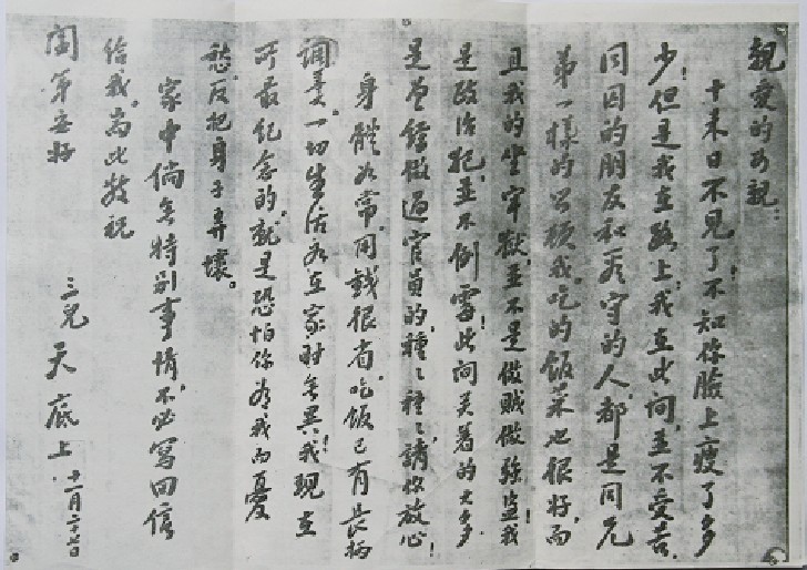 请你转告念先,他是幼年失了母亲的人,我的母亲是非常爱怜他的。我在希望他,在我生时一样的看待我母亲。他现在既不能回上虞,又无处存身。我希望他投奔费德兴之处存身。李、罗二同志是最英雄、最忠实的同志,不要以我死而灰心,继续奋斗。因时间关系,不能多写。从此永诀。