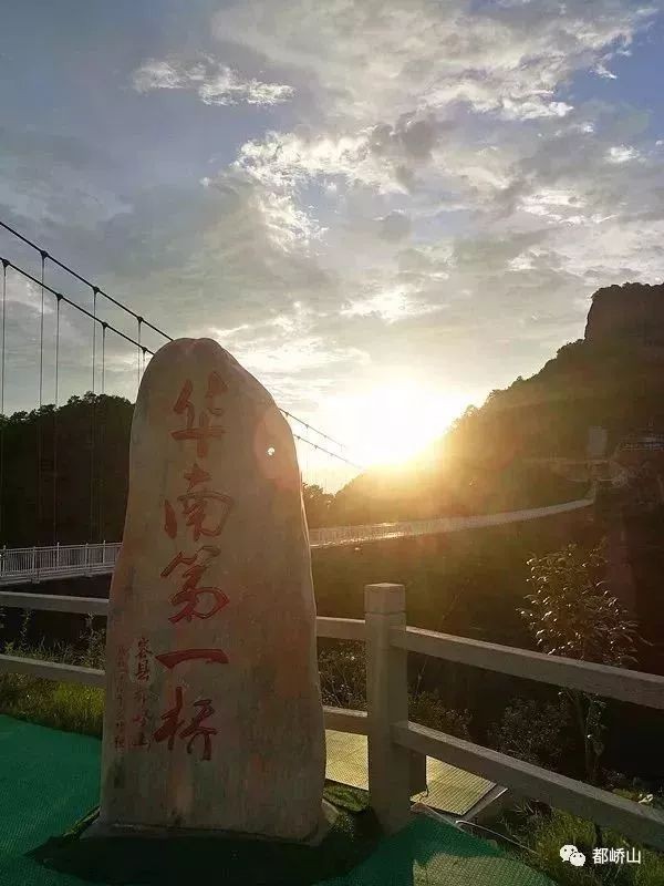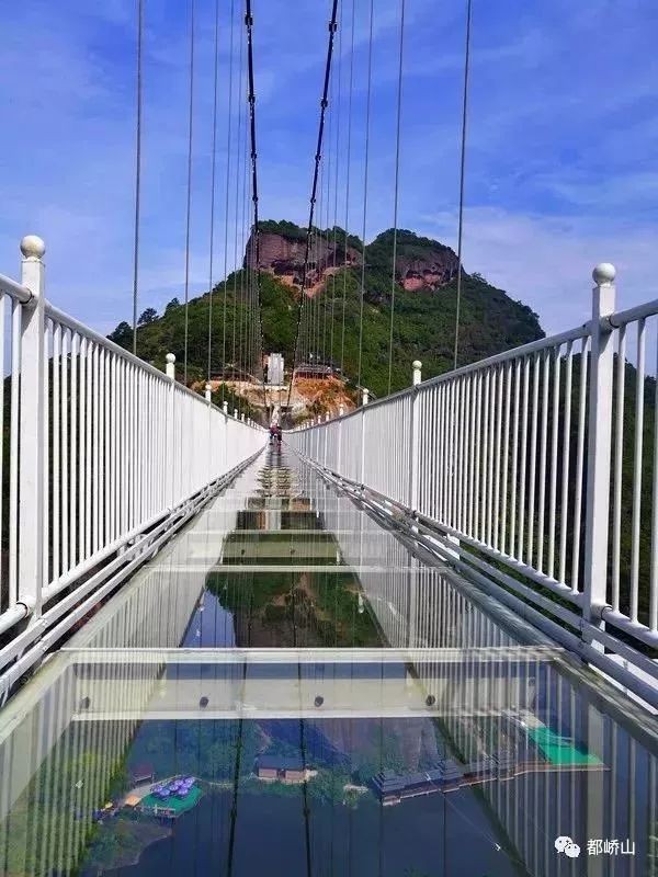 都峤山玻璃天桥,又称“白鹤云渡桥”。桥长330米,垂直高度100多米。建成时是华南地区跨度最大、高度最高的玻璃天桥。玻璃天桥自2018年2月11日正式开放运营以来,慕名而来的游客络绎不绝。玻璃天桥每根钢丝绳采用叠加方式使其受力更加均匀,可容600人同行。桥面的玻璃则使用了全钢化玻璃组合而成,每平方米受力可达数百公斤以上。