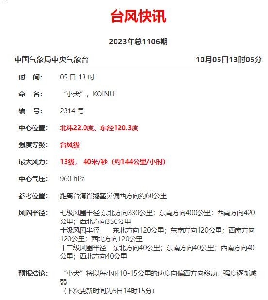 第14号台风“小犬”(13级,40米/秒,台风级)今天11 时中心位于台湾省鹅銮鼻西偏北方向约30公里的海面上,以每小时10~15公里的速度向偏西方向移动。受其影响,今天我市沿海东北风7~8级,阵风9~11级;高海拔山区东北风9~10级,阵风11~13级。请注意防范!