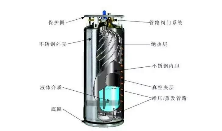 上部有保护圈、管路阀门系统,中间瓶体呢有不锈钢外壳、绝热层,里面有不锈钢内胆、真空夹层,最里边就是装的液体介质,底部有增压/蒸发管路、底圈。