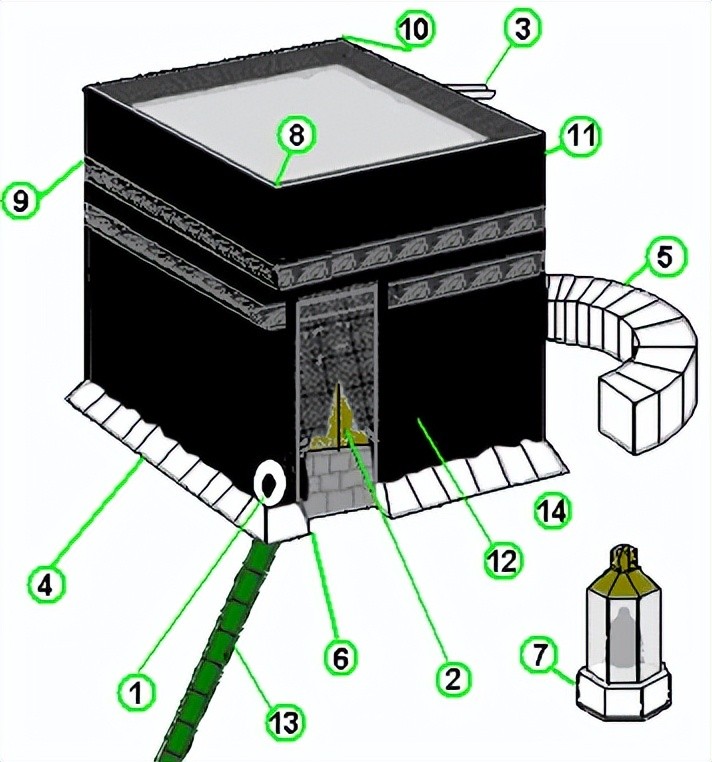 1黑石 2大门 3排水沟 4天房的基座 5哈提姆 6大门与黑石之间墙 7亚伯拉罕的脚印 8黑石角 9也门角 10沙姆角 11伊拉克角