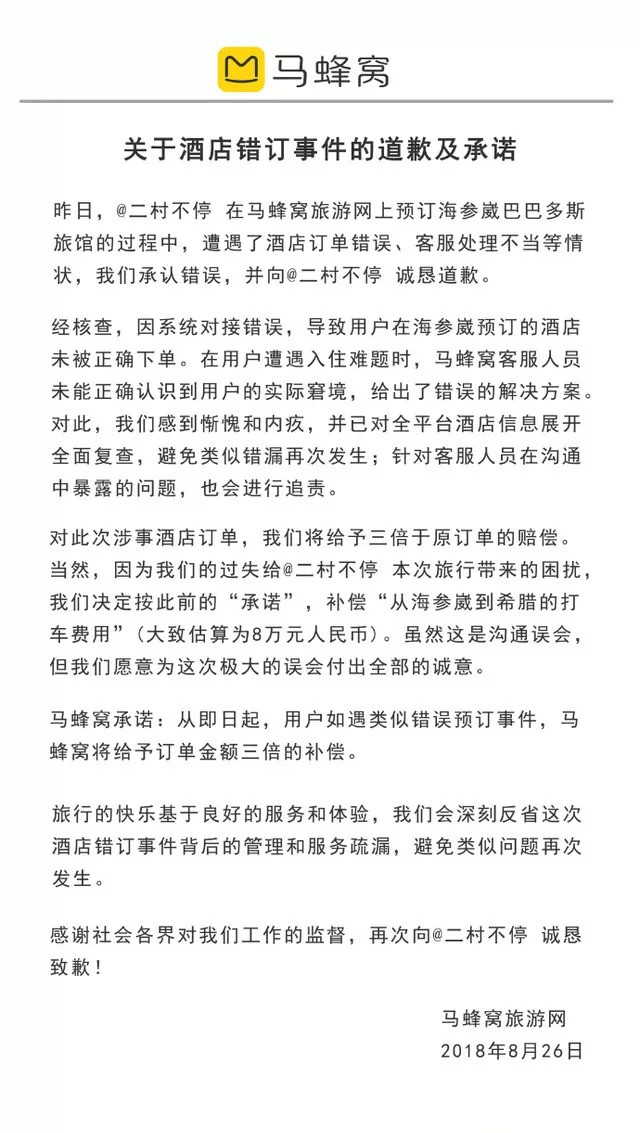 经核查因系统对接错误,导致用户在海参崴预订的酒店未被正确下单。马蜂窝对此次涉事酒店订单将给予三倍于原订单的赔偿,并补偿该用户“从海参崴到希腊的打车费用”(大致估算为8万元人民币)。