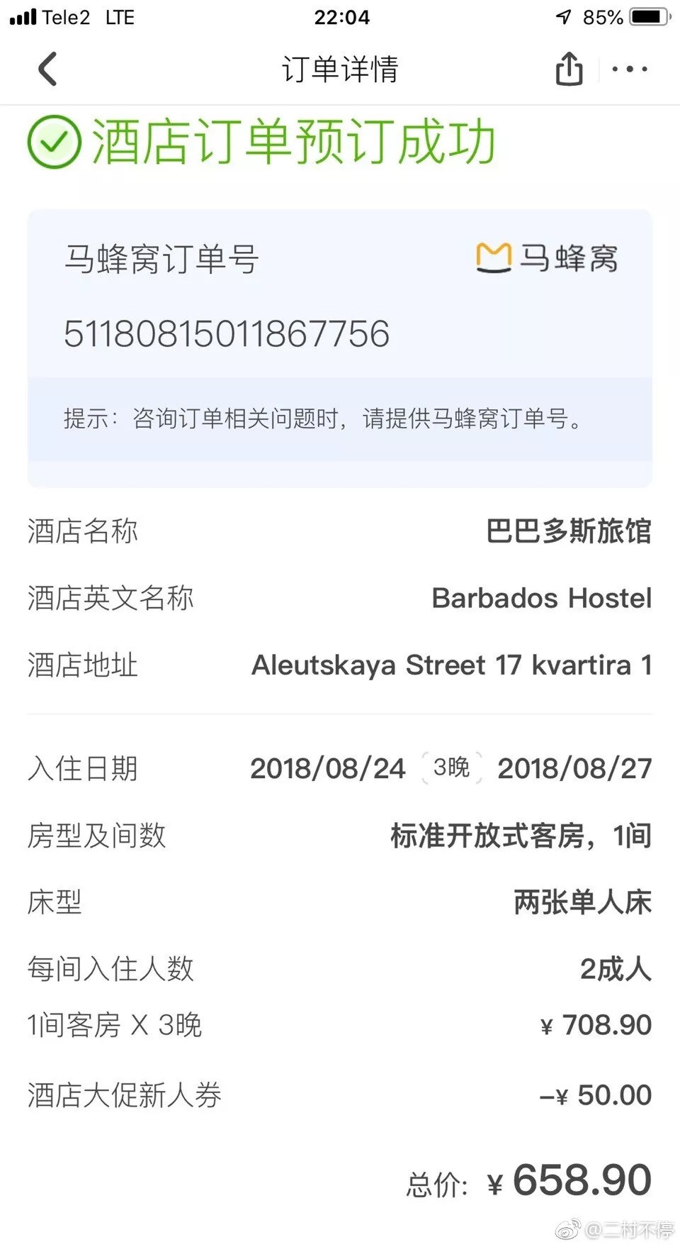 @二村不停 详细描述了事情经过:8月15日,自己在马蜂窝预订了海参崴巴巴多斯旅馆(Barbados Hostel)08月24日至08月27日共3个晚上的住宿。