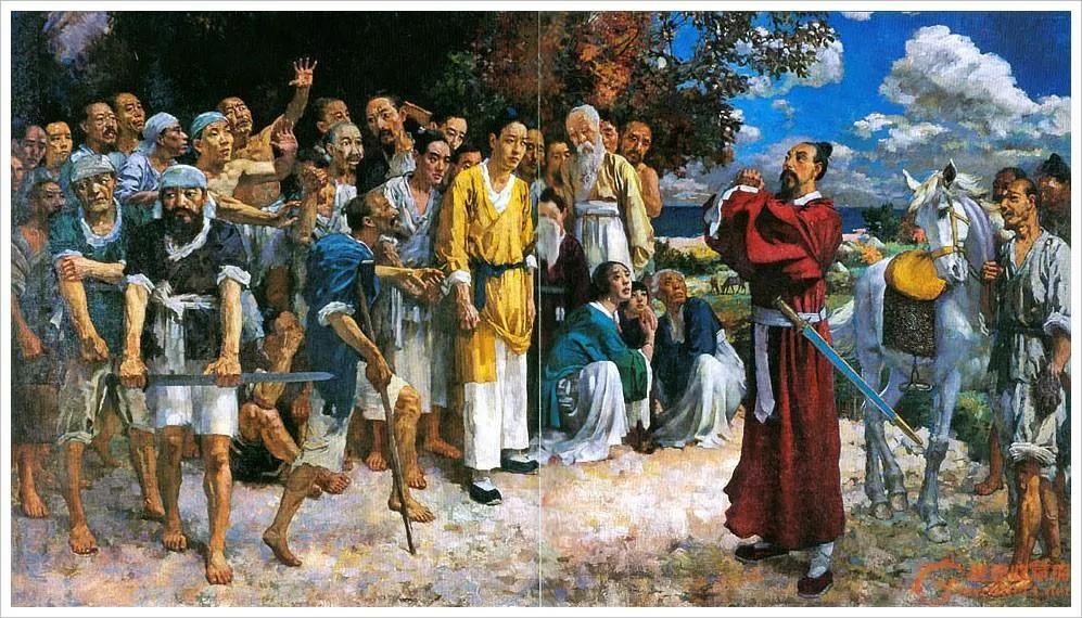 这幅《田横五百士》是徐悲鸿的成名大作。故事出自《史记·田儋列传》。田横是秦末齐国旧王族,继田儋之后为齐王。刘邦消灭群雄后,田横和他的五百壮士逃亡到一个海岛上。刘邦听说田横深得人心,恐日后有患,所以派使者赦田横的罪,召他回来。正是有感于田横等人"富贵不能淫,威武不能屈"的"高节",着意选取了田横与五百壮士惜别的戏剧性场景来表现。