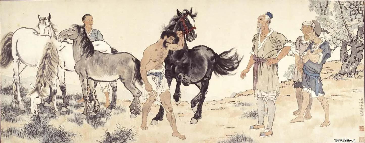 九方皋故事记载于《列子》:伯乐暮年之向秦穆推荐九方皋找千里马的故事。作品是一件非常完整和精彩的以线为主要表现手段和描绘方式的优秀的中国画作品。