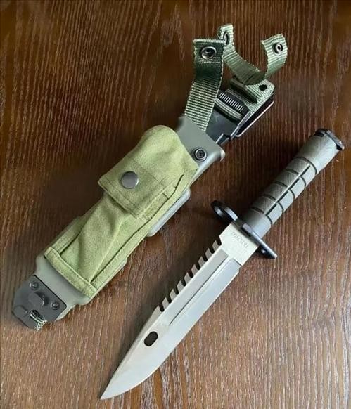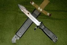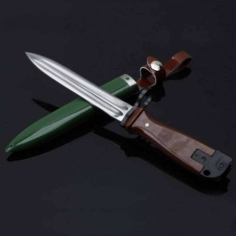 81式刺刀的刀柄较窄采用褐色塑料制造,护手处有环扣可套在八一杠枪管上,刀鞘为军绿色塑料材料制造的壳体,刀鞘上有挂带组成,可以和内腰带或者武装带相结合便于携带行军。这种两用军刀虽然并不是真正意义上的多功能匕首,但是在野战情况下,这种军刀除了近身搏杀之外,还能用来割绳索电线、挖树根竹笋、攀爬树木峭壁,或者用来开罐头挑午餐肉吃,老山前线的老兵们不少都是这么用刺刀的。