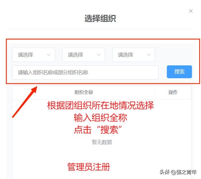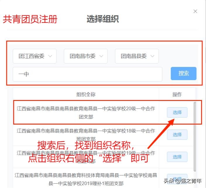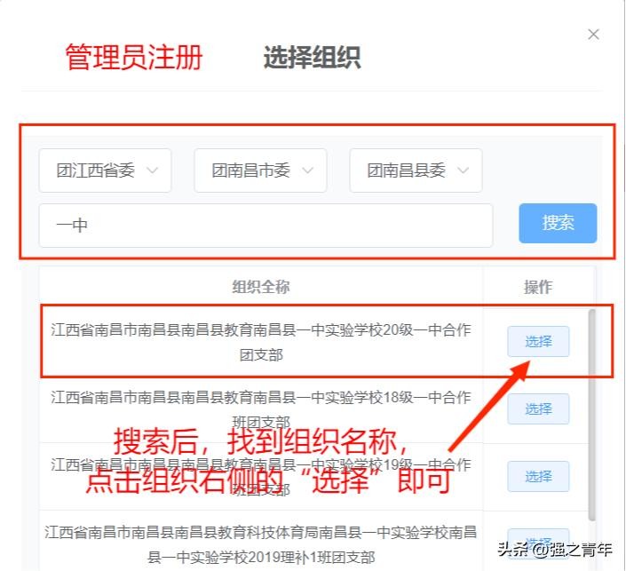 ②根据实际情况选择团组织,输入注册组织名称后,点击搜索,找到组织后,点击转入组织右侧的“选择”按钮即可。