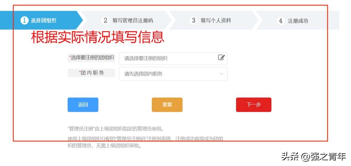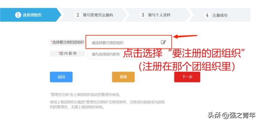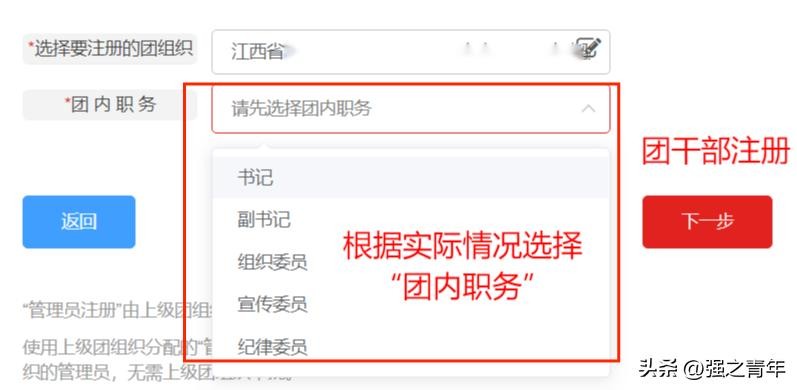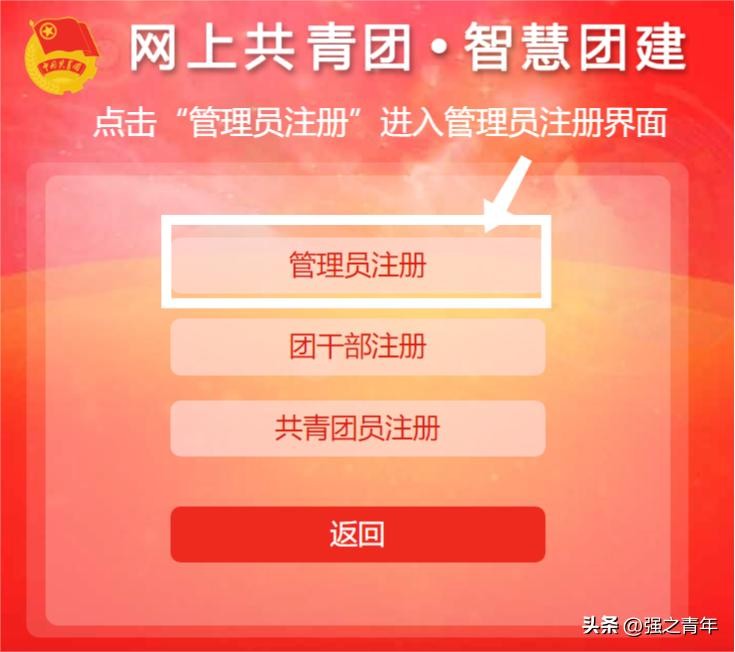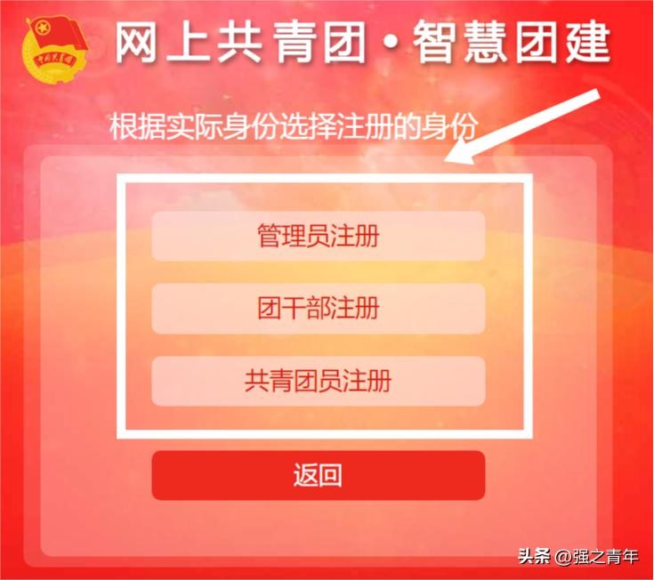 3、进入注册界面后,根据实际情况选择“管理员”身份/“团干部”身份/“共青团员”身份。