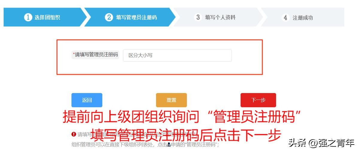 注意:(1)管理员注册码是长度为八位、由“数字+字母”构成的字符串,填写时需要区分字母大小写。(2)管理员注册码的有效期为20天,超过有效期需联系上级团组织管理员生成新的管理员注册码。(3)一个管理员注册码仅限一位管理员注册使用。