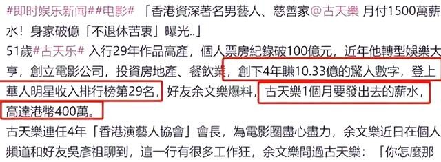 这可太厉害了,简直就是演艺界的 “隐形大佬”,余文乐和吴彦祖之前在采访里透露,古天乐一直拼命工作,就是为了能每个月准时给员工发工资,每个月光发工资就得花 400 万港币呢。