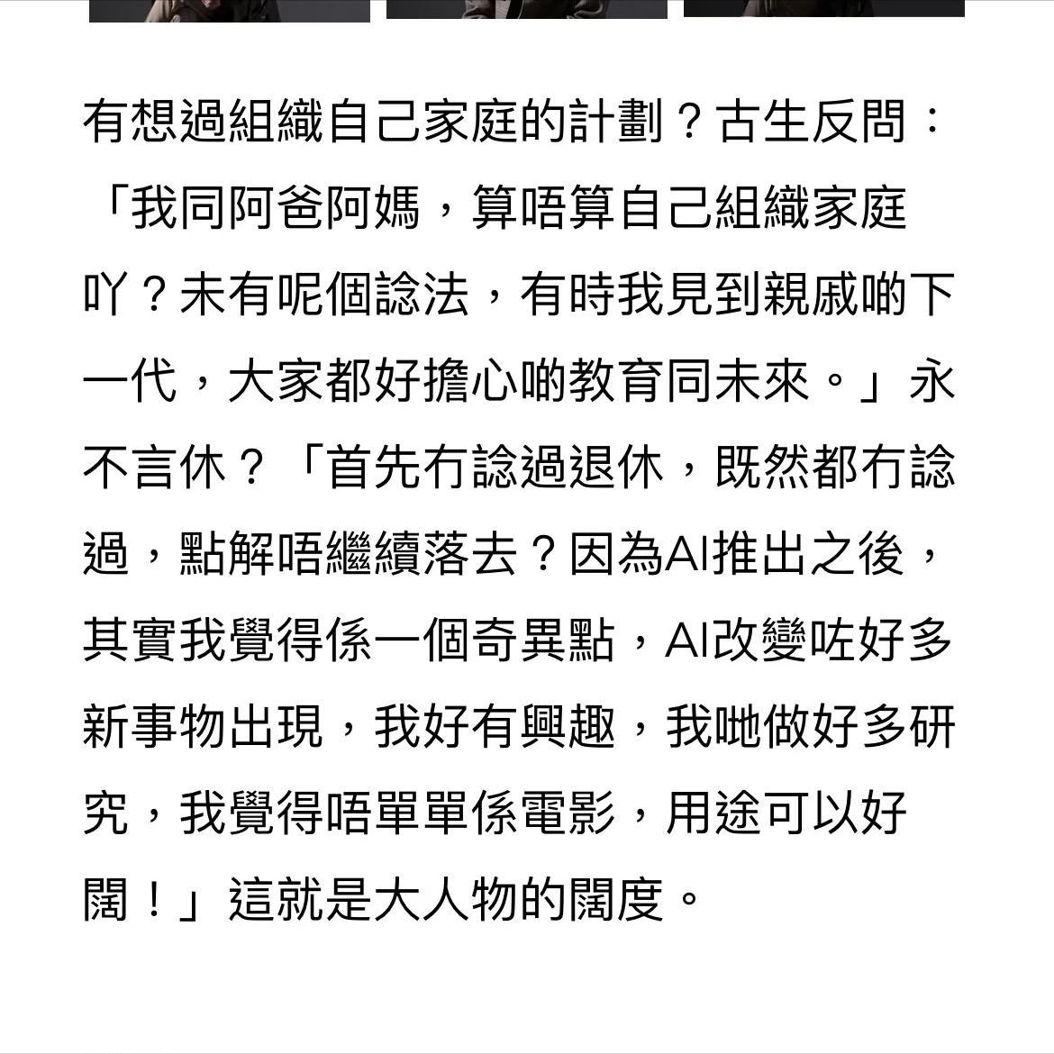 之前53岁的古天乐接受港媒专访时,透露自己永不退休,他说自己对 AI 很感兴趣,还做了不少研究,觉得 AI 能应用到电影之外的很多地方,看来古天乐一直都在关注新事物,想要不断突破。