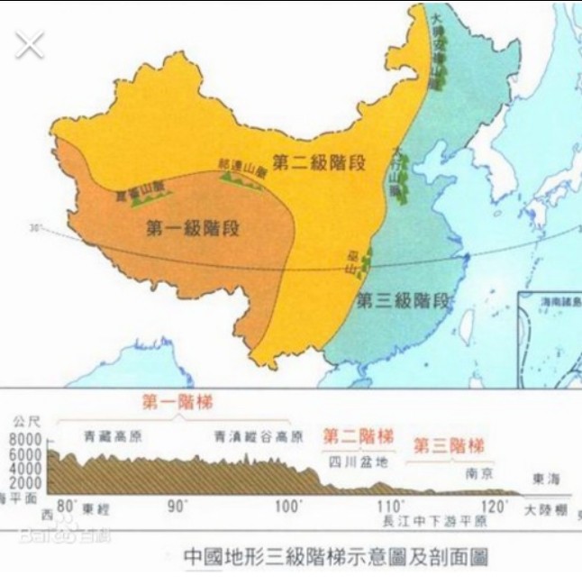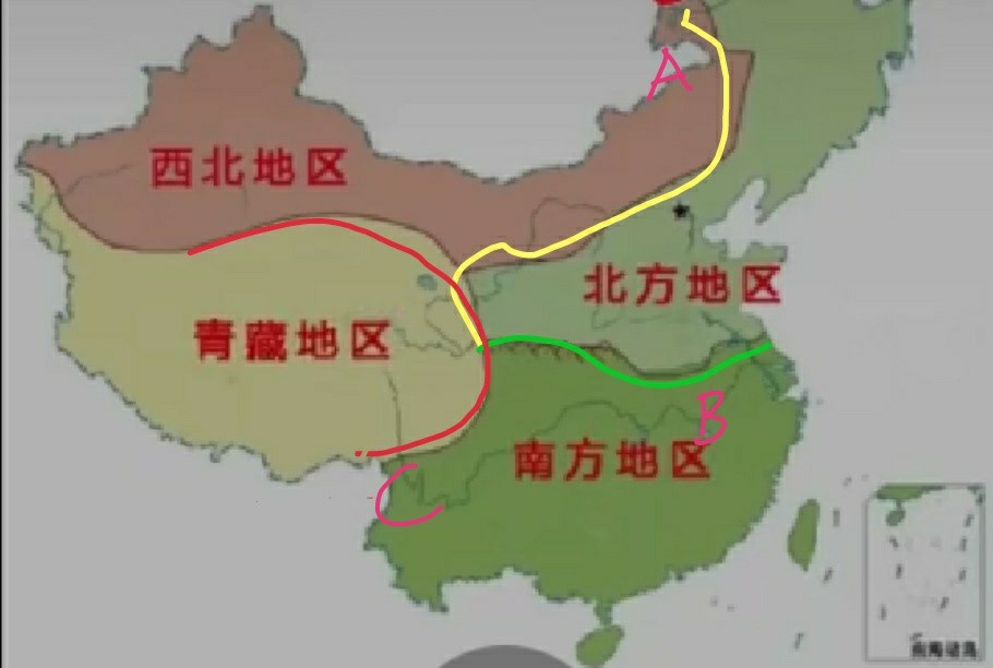 界线C:主导因素是地形地势,即第一阶梯和第二阶梯的分界线(昆仑山脉—祁连山脉—横断山脉)》(脑补:我国地形的三大阶梯(百度搜):第一,二阶梯分界线:昆仑山脉,祁连山脉,横断山脉。第二,三级阶梯分界线:大兴安岭,太行山,巫山,雪峰山)