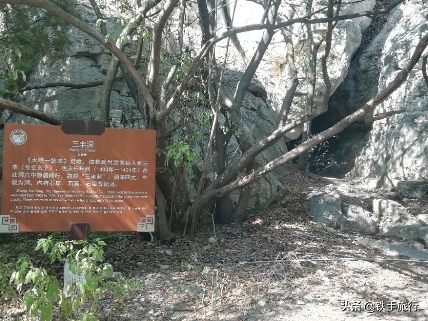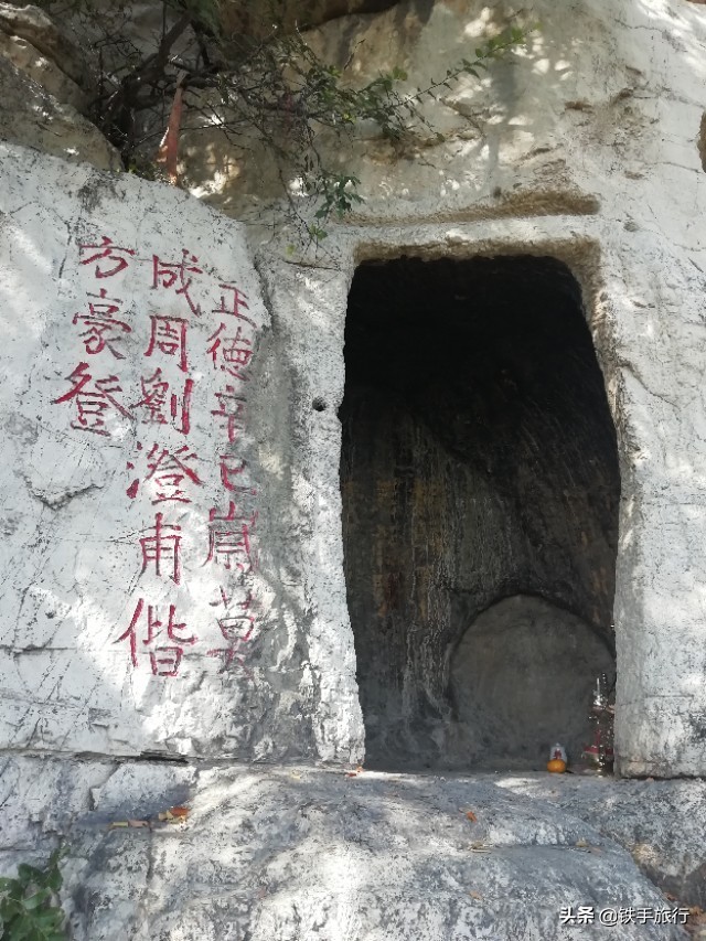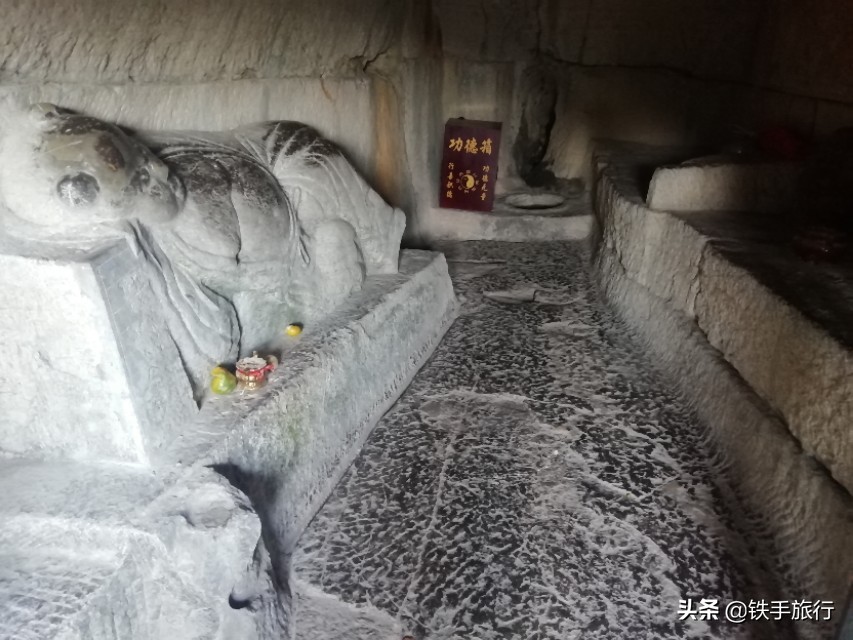 万春洞,洞雕有宋道教首领陈抟老人枕书长眠的卧石像一尊。