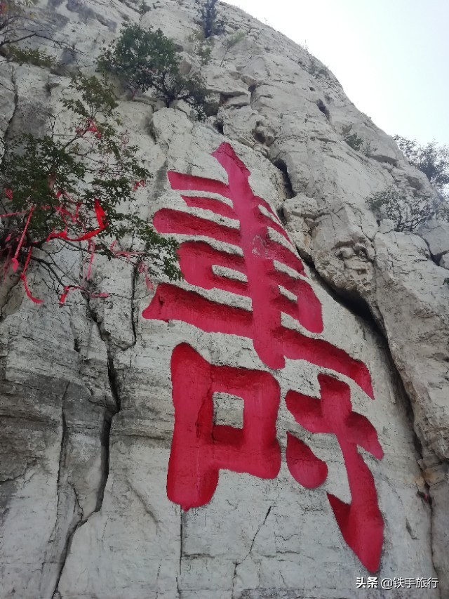 大“寿”字,字体结构严谨,端庄大方,坐南朝北,通高7.5米,宽 3.7米,仅“寿”字下面的“寸” 字就高达2.23米。所以当地人有“人无寸高”、“寿比南山”之说。