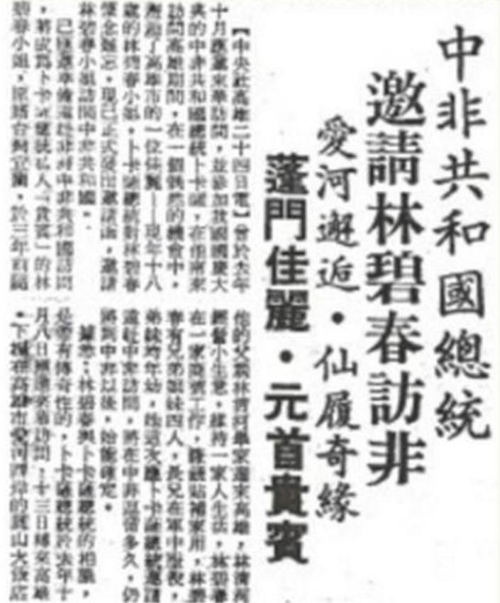 1968年,博卡萨到中国旅游,认识了一位18岁的服务员,这个人就是博卡萨将来的中国王妃——林碧春。要说林碧春其实也姿色平平,而且以博卡萨的地位,要什么样的美女都有,但不知为何,他偏偏看上了林碧春。