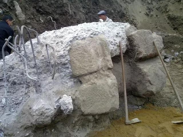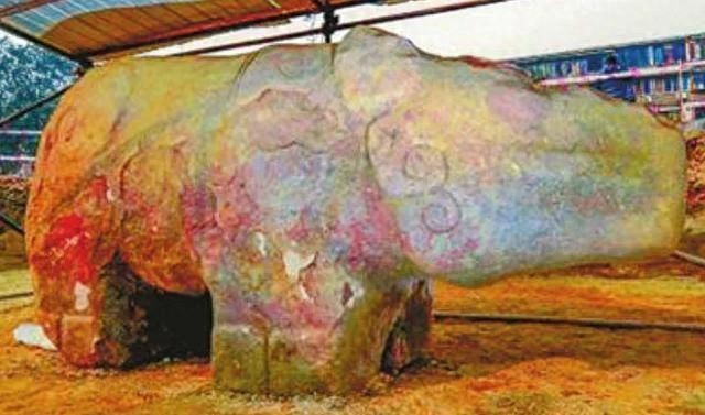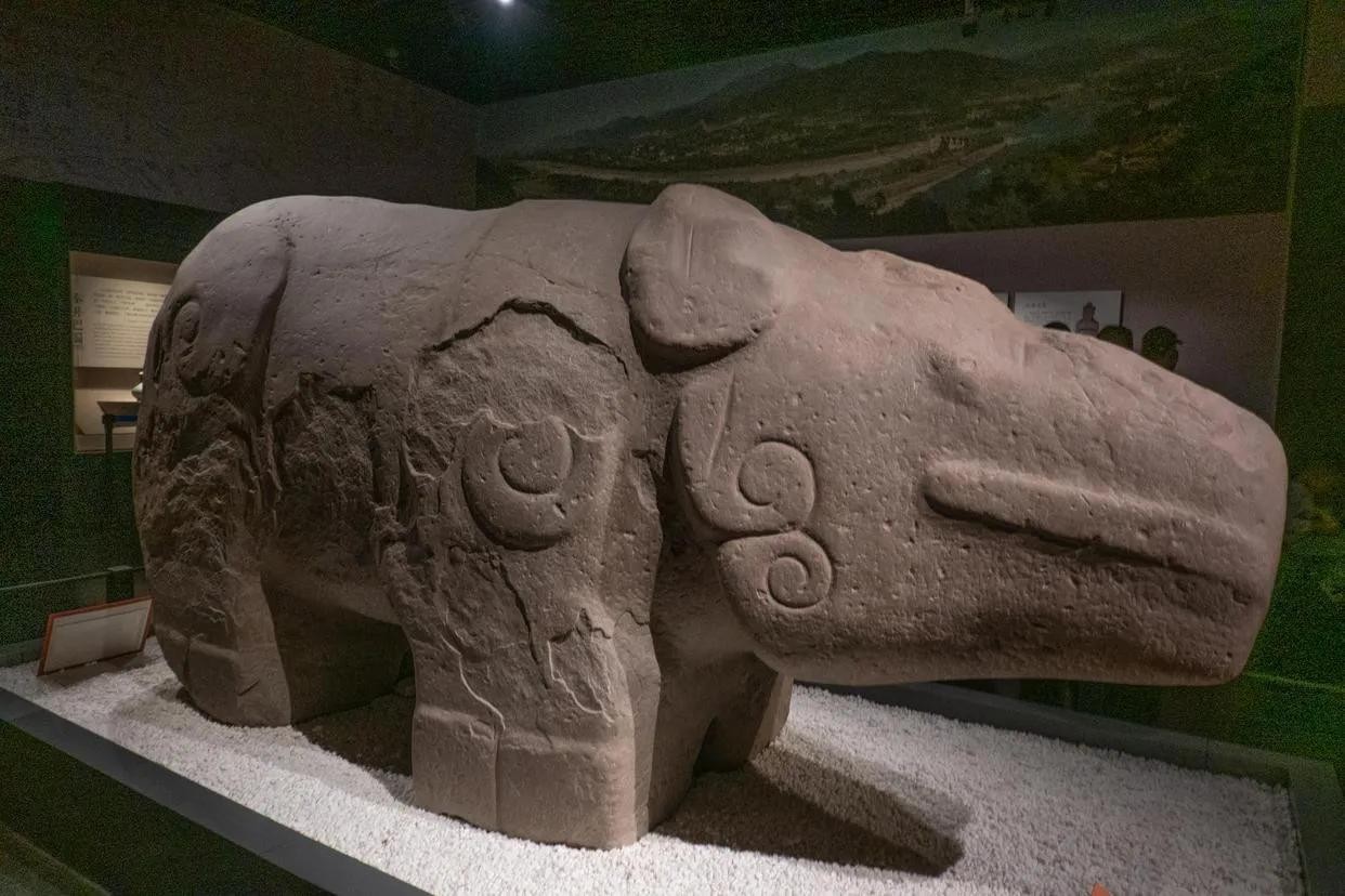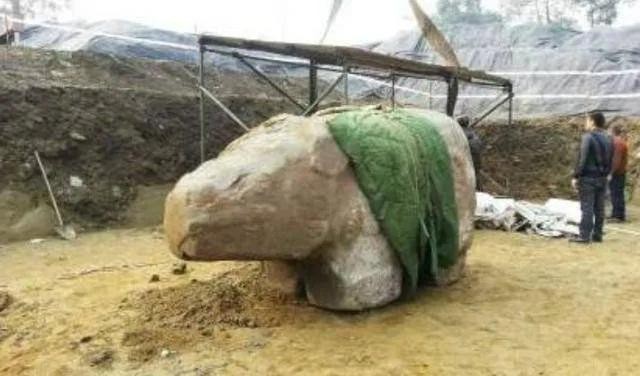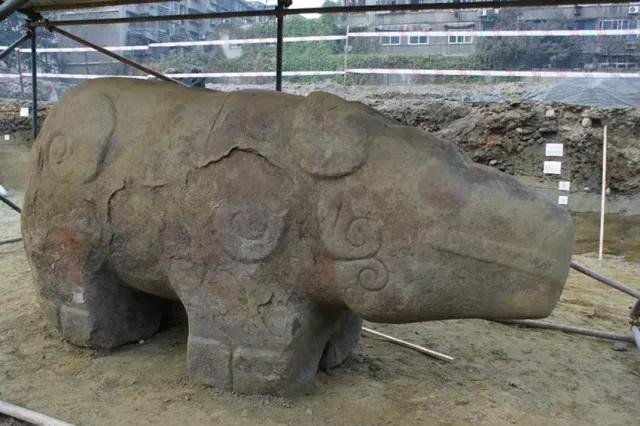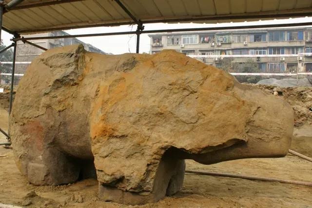 1973年11月,成都市政府于今天府广场北侧修建电信大楼,承建方为四川省第三建筑公司。公司委派技术员车凡英来“蹲工地”查勘。一天,正在地基打桩作业的工程人员,发现大楼附楼东北方位有一个地方“冥顽不化”,基桩打不下去。工人挖开一看,却是一块大“石头”。足足挖开 一个直径2米的大坑,才看到一只肚子朝外翻的神秘动物,有点像犀牛,但制型“比牛还大”……