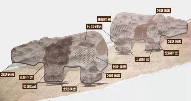 4、“面膜”脱盐:用湿纸浆或者湿宣纸,吸附在石兽表面,等石兽体内的盐分富集出来,凝固在面膜的表层。每天需要不停地更换纸张,大量的可溶盐分就会被迁移出来。脱盐成功后,针对文物的风化、粉化病害对其进行加固。后期还对固化后的石兽进行有依据的局部修补,力求呈现最真实的文物原貌。