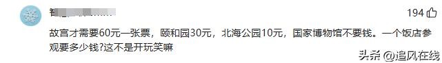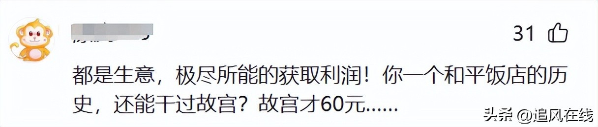 有多位网友说:“故宫才需要60元一张票,颐和园30元,北海公园10元,国家博物馆不要钱。一个饭店参观要多少钱?这不是开玩笑嘛”。这位网友说的好,论历史背景,故宫可以让和平饭店望其项背,皇帝住的地方,不比它悠久?
