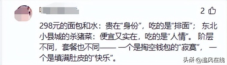 这位网友调侃说到:298元的面包和水:贵在“身份”,吃的是“排面”; 东北小县城的杀猪菜:便宜又实在,吃的是“人情”。 阶层不同,套餐也不同—— 一个是掏空钱包的“寂寞”, 一个是填满肚皮的“快乐”。