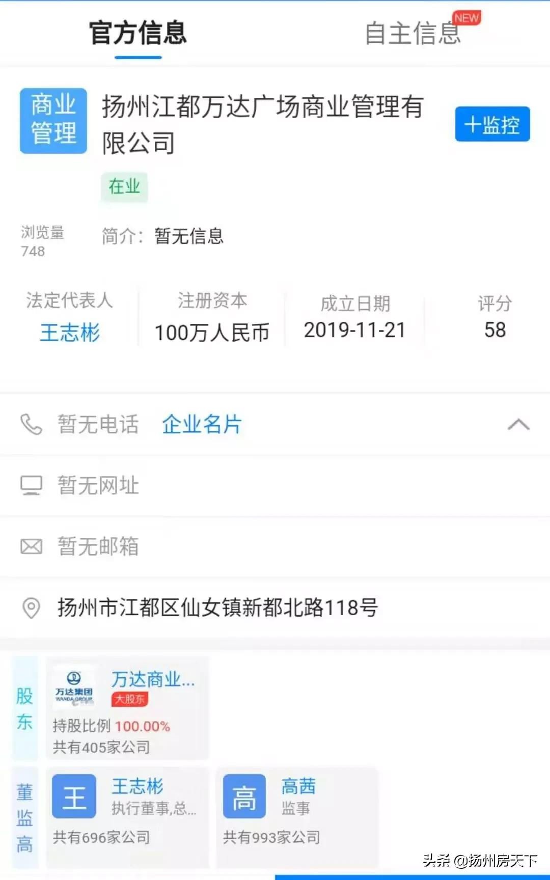 通过查询可以看到,早在2019年11月21日,扬州江都万达广场商业管理有限公司成立。