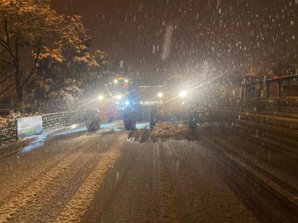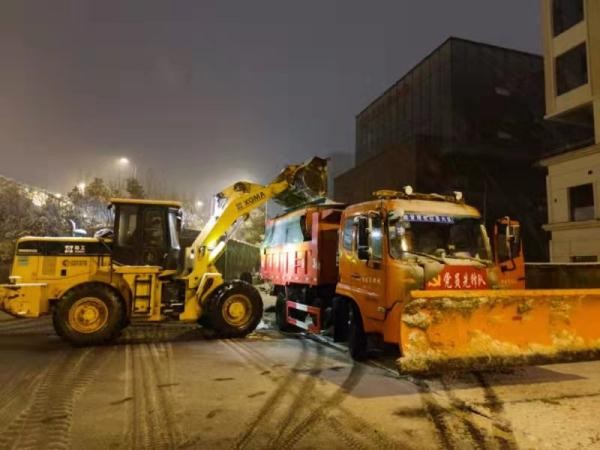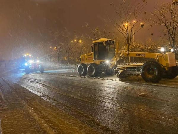 滨湖城管办目前出动20人在滨湖主干路面铲雪,机械3台平地机,1台装载机辅助作业。