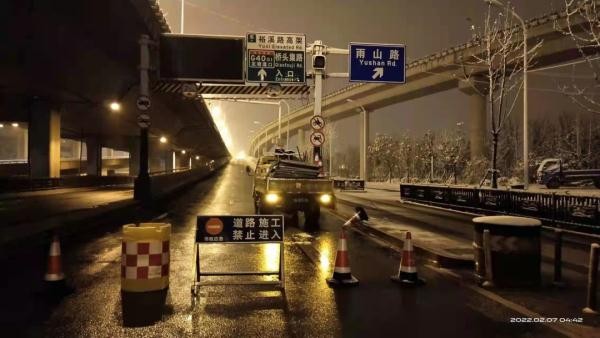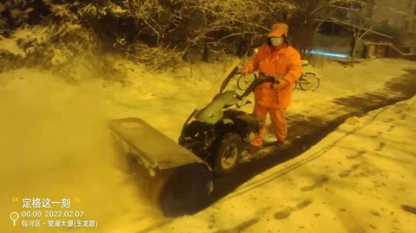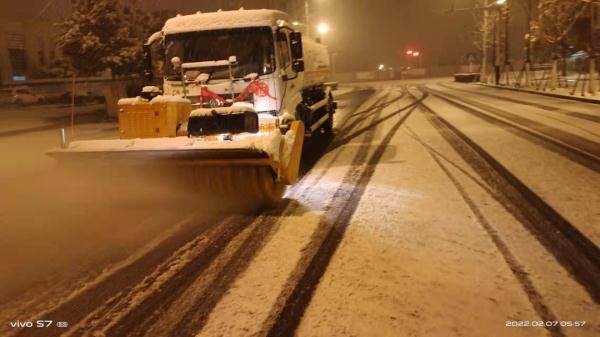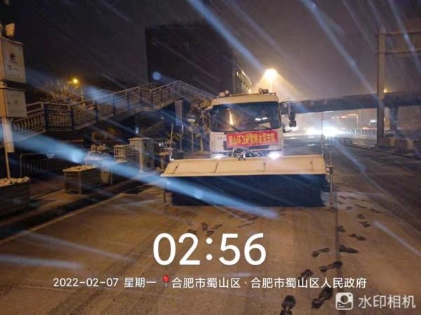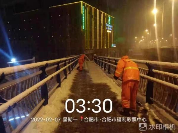 2月7日凌晨两点,一直处于待命状态的包河区城管局环卫中心应急队伍发动2000余名环卫工人及时出动,在全区各主次干道、横跨桥、地铁口、公交站台等区域洒布融雪剂、铲除积雪。凌晨四点,环卫工人全员到岗,对地铁口、公交站、横跨桥面、医院小区出入口等区域进行重点清理。大型滚雪机、平地机、小型滚轮式推雪铲、吹雪机等设备上路作业,清理城市主干道、辅道等积雪。