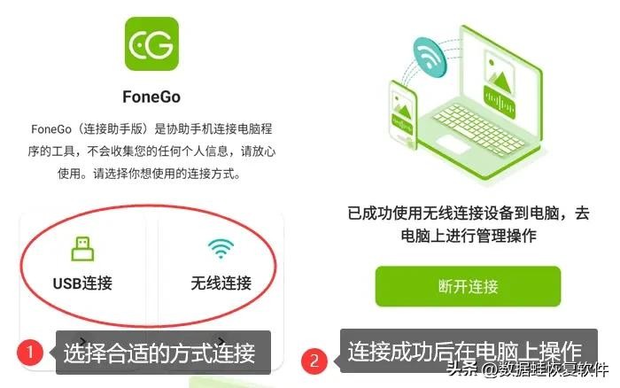 步骤1:电脑上下载安装完成【数据蛙安卓恢复专家】后,手机下载【FoneGo】,然后选择合适方式连接手机和电脑,连接完成后回到电脑上操作。