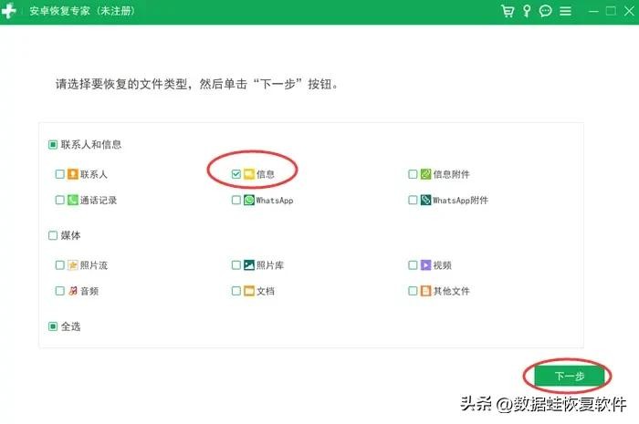 步骤2:在电脑上点击所需要恢复的文件类型,即勾选【信息】,精确选择可以缩短扫描时间哦。完成后点击下一步等待扫描。