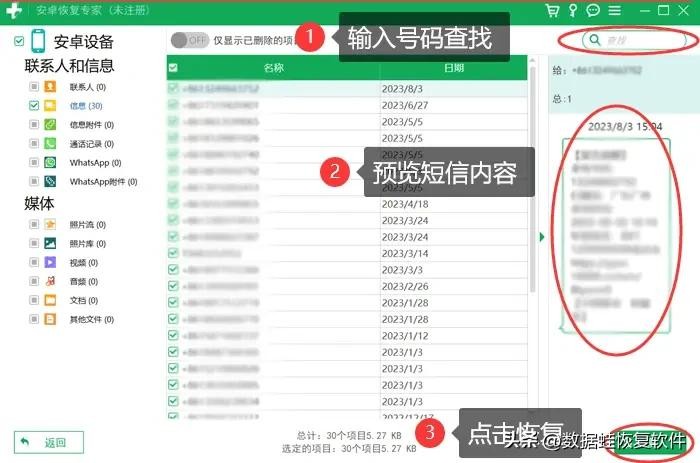 步骤3:扫描完成之后就可以输入号码查找短信啦,如果不清楚号码,也可以自己查看,只要左键单击号码就能在页面右框预览短信内容。确认需要恢复的短信之后点击恢复!