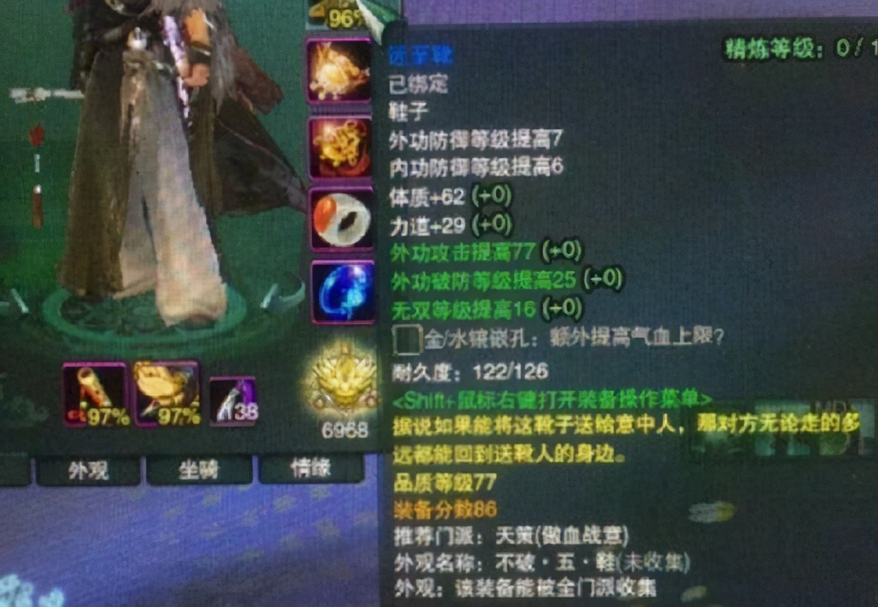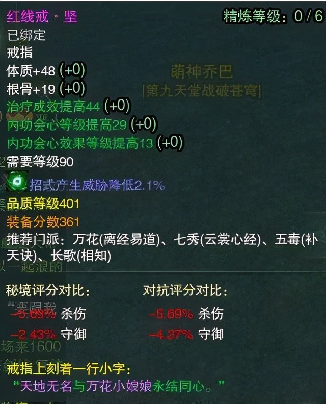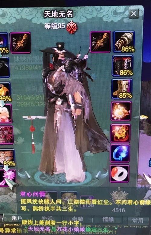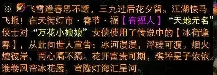 细心的玩家可以发现,无名在挂机的时候,身上的装备总是那几样,每一件的下面都有几行黄字,诉说着对万花小娘娘的思念。一些挂饰上面还刻着许久前的七夕任务的小字:天地无名与万花小娘娘永结同心。可能正如远至靴写的:据说如果能将这靴子送给意中人,那对方无论走的多远都能回到送靴人的身边。