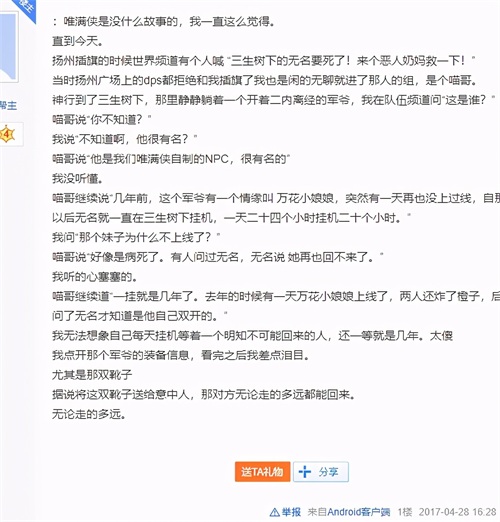 不管怎样说,希望看到这里的各位侠士把它当成一个故事看就好,不用去追究故事的真假。至少这个故事带给过我们感动,让我们亲眼见证了这个痴情人。