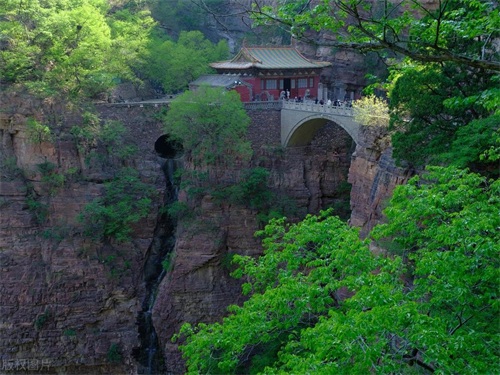 5、苍岩山:位于石家庄井陉县,最高峰海拔1039米。山体由石灰岩构成,形成于18亿年前。山间分布福庆寺、桥楼殿等建筑,桥楼殿建于北魏,横跨两座悬崖之间,下方为深涧。苍岩山现存古树名木200余株,包括树龄千年的侧柏。每年农历三月初三举办庙会。