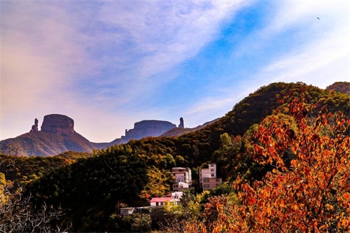 4、嶂石岩:位于石家庄赞皇县,主峰黄庵垴海拔1774米。景区以丹霞地貌为主,岩壁呈红色,垂直高度超过200米。嶂石岩地貌命名源于此地,特点是长墙状山体与阶梯状陡崖。景区内有回音壁、九女峰等自然景观,回音壁实测回音效果达85分贝。