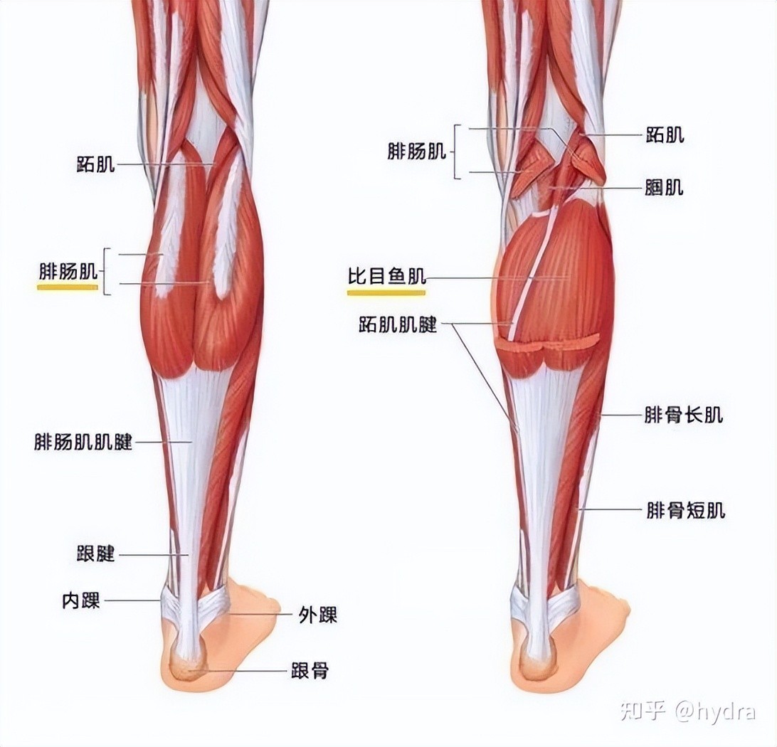 我们要先了解一下肌肉的解剖,以小腿肌后侧范例,我们可以由上图去看到,左边显示的是表层肌群,从跟腱开始往上衔接腓肠肌并延伸到膝窝,同时看向右图,腓肠肌覆盖着比目鱼肌