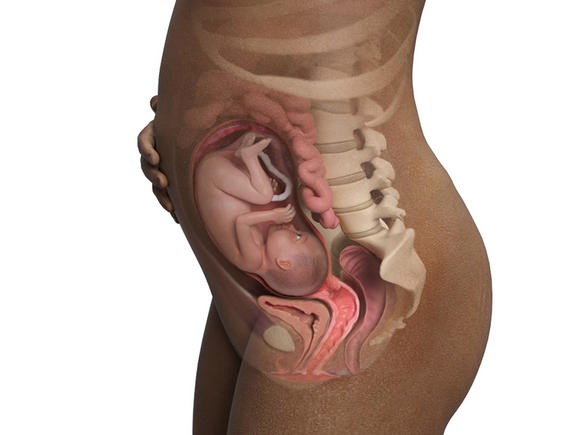 在该图中,你会发现,你成长的宝宝占用了相当多的房间,这些天。在孕晚期,你可能会更频繁地小便或有腿抽筋,他压着神经在你的臀部和背部。
