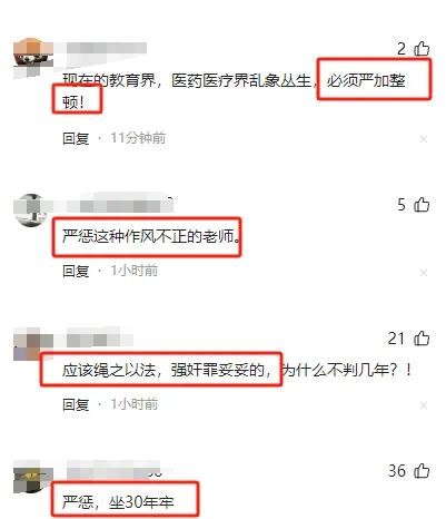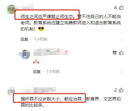还有网友表示:“师生之间应严律禁止师生恋。管不住自己的人不能当老师。”“强奸罪不论岁数大小,都应治罪,教育界,文艺界犯罪的比较多。”