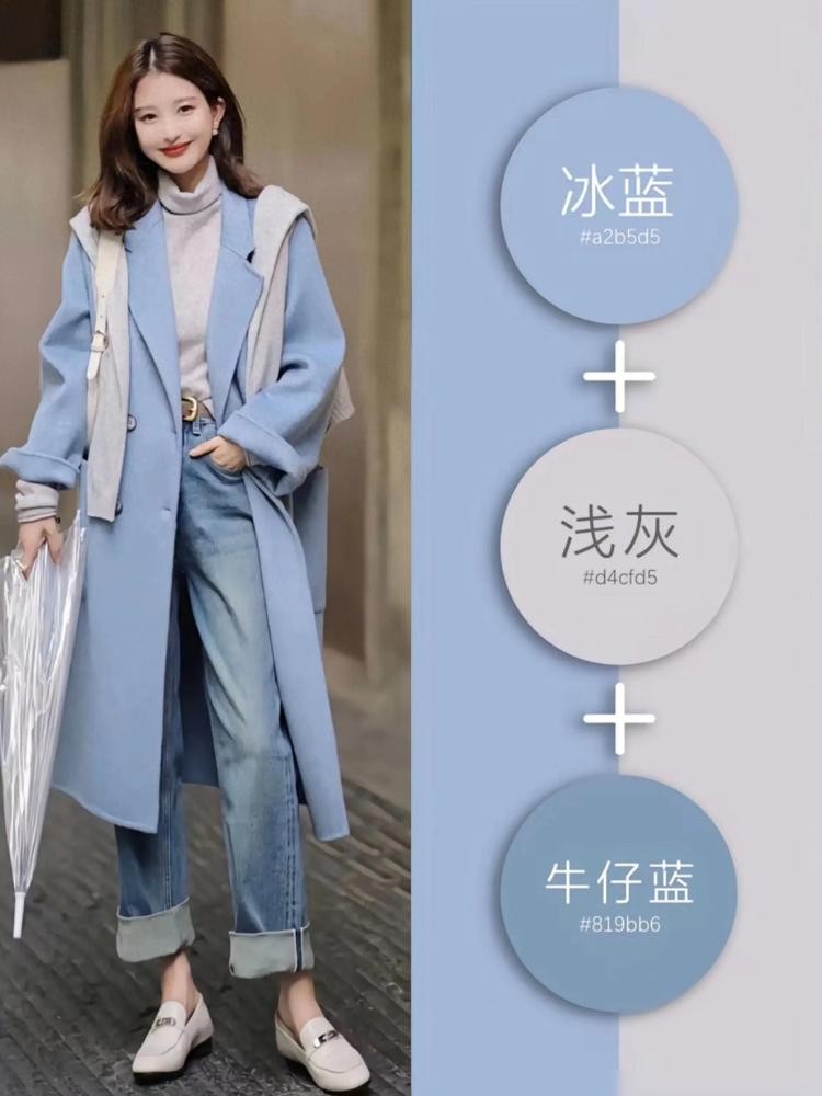 比如可以选择一条蓝底米白图案的大衣透着温暖阳光气息,而内搭可以有类似图案小面积范围竖直叠加。