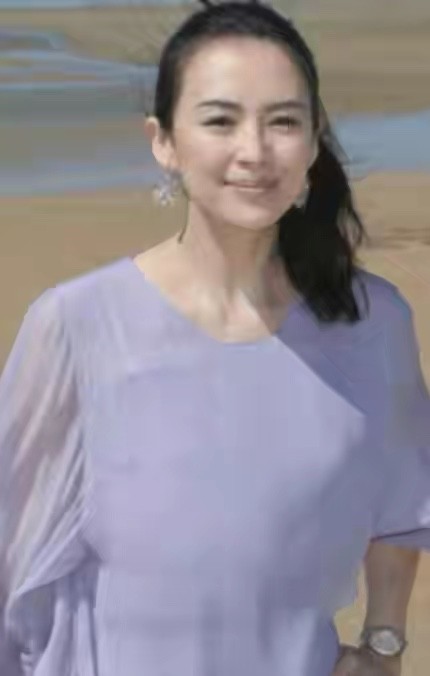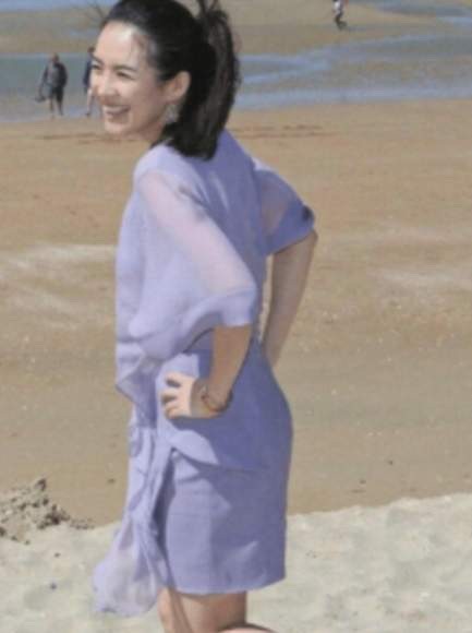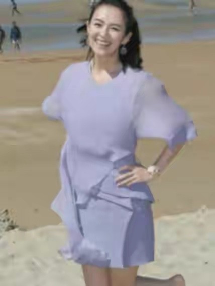 章子怡海滩照曝光,穿紫色透视衫宛若仙子,无修饰的双腿更真实