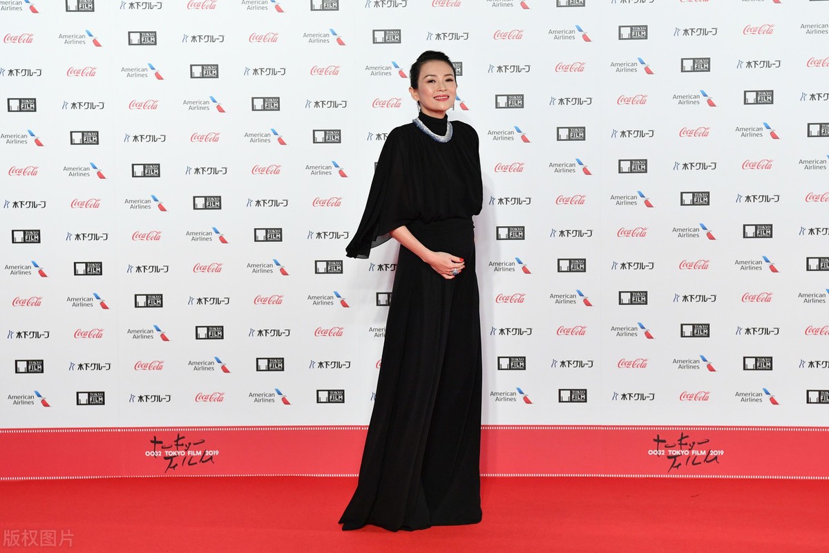 相对于淡雅的色系,一些高级端庄的颜色会更加适合舞台造型。虽然日常生活中章子怡甜美可人,舞台上的她却是冷静又高贵的。穿着黑色长款连衣裙,有些宽松的造型更加随性优雅。自然的落肩款式搭配五分袖的设计,让她的姿态更加从容。尤其是颈部点缀了珍珠项链的修饰,更多了几分雍容华贵的美感。